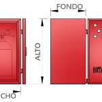Cajón para extintor disponible en chapa de acero lacado en color rojo, perforado para ventilación y grabada el contenido en el exterior de la puerta.